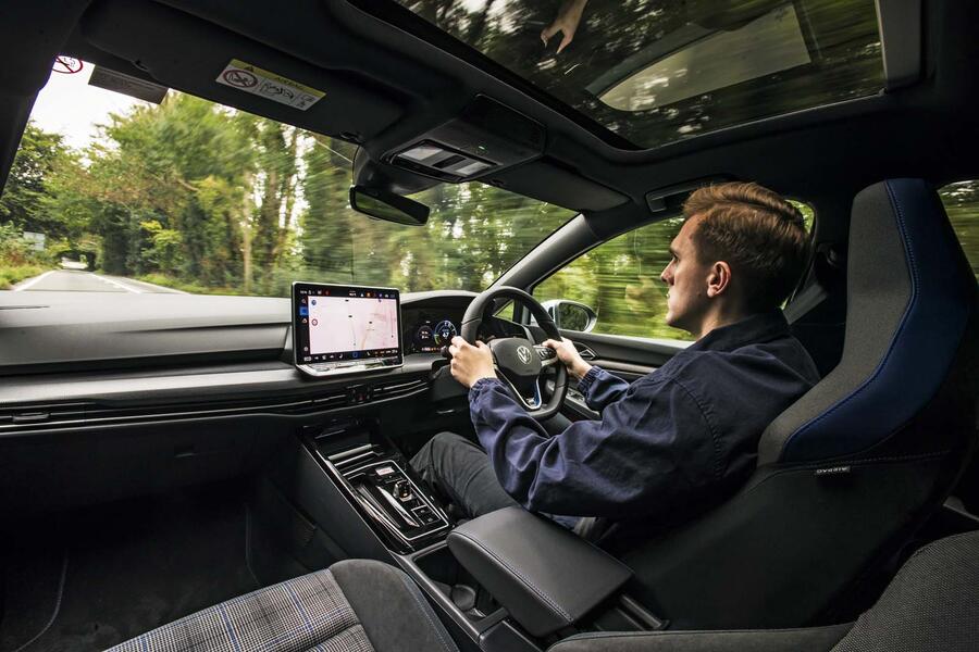 Inside, the GTE follows the same recipe as the standard Golf: a huge 12.9in central touchscreen dominates the dashboard, physical buttons are restricted mainly to the steering wheel and copious amounts of gloss black plastic are used throughout.