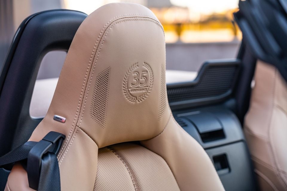 There’s a renewed sense of quality to the materials, too. Premium Nappa leather now covers the seats (which also feature 35th Anniversary embossing on the headrest), while lush 35th Anniversary floor mats rest proudly beneath your feet. Beige stitching completes the look, contrasting neatly with the black leather used for the steering wheel, manual shifter, and handbrake boot.