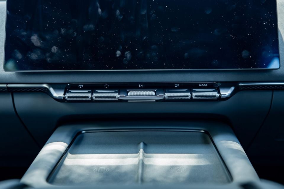 Below the screen there is still a volume scrolling wheel, and that also doubles as a push button for play/pause. There are a couple of other controls, including a mode selector, boot opening button, glovebox button, and a custom button. In this car, it was set for the rear-seat interior camera, which can film, photograph or even create a GIF. Or you can cover it with the integrated camera cover.