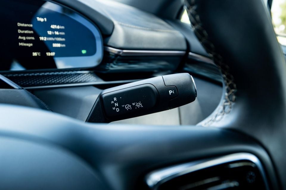 Off the steering column there is a left-side stalk to operate the wipers and blinkers, while the right stalk is your column-shift gear selector. That gear selector also doubles as your actuator for cruise control or Pilot Assist features, and it will take a little bit of getting used to if you are uninitiated with that kind of action.