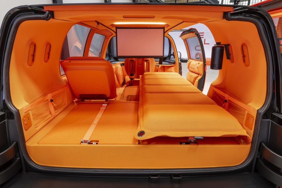 While the rear seats cannot be fully removed, the bases can be taken out and used as stools as they include fold out legs. When the rear seats are folded down, a pair of single mattresses can be lowered from the ceiling to turn the car into a camper.