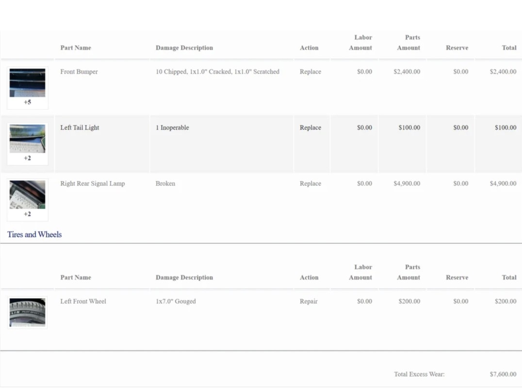 The $100 charge for the left taillight left the lessee confused, as they could find no issue with this part. The only charge the driver deems fair is $200 for a damaged left front wheel.
